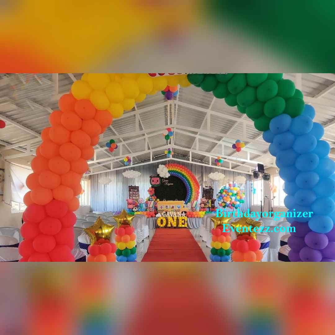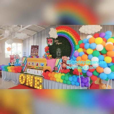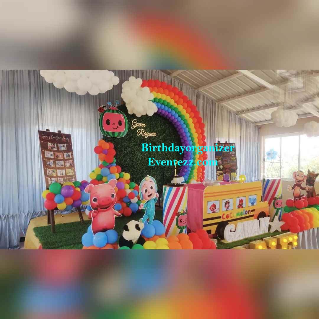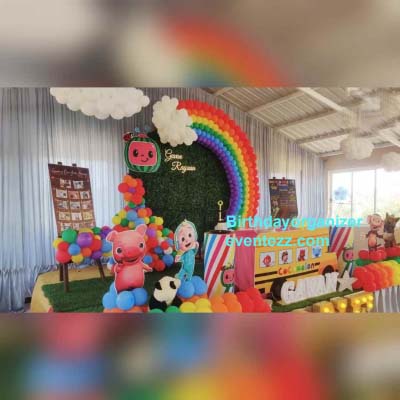 Complete Cocomelon Theme Birthday Party Decorations from welcome Board to Main Backdrop to Hall Decoration.
